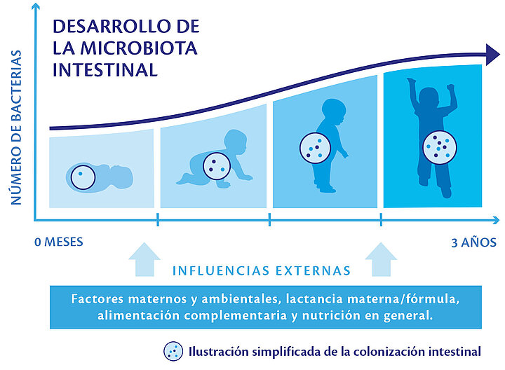 En los bebés, la flora intestinal debe primero colonizarse y desarrollarse. Al nacer, la mucosa intestinal está casi sin colonizar. Después de unos tres años, el desarrollo de la flora intestinal está en gran parte completo.